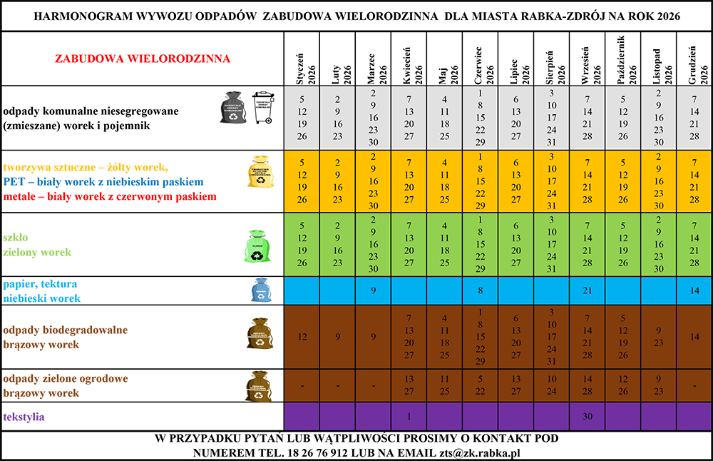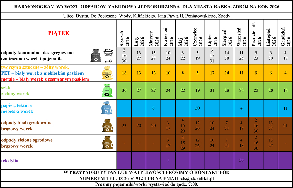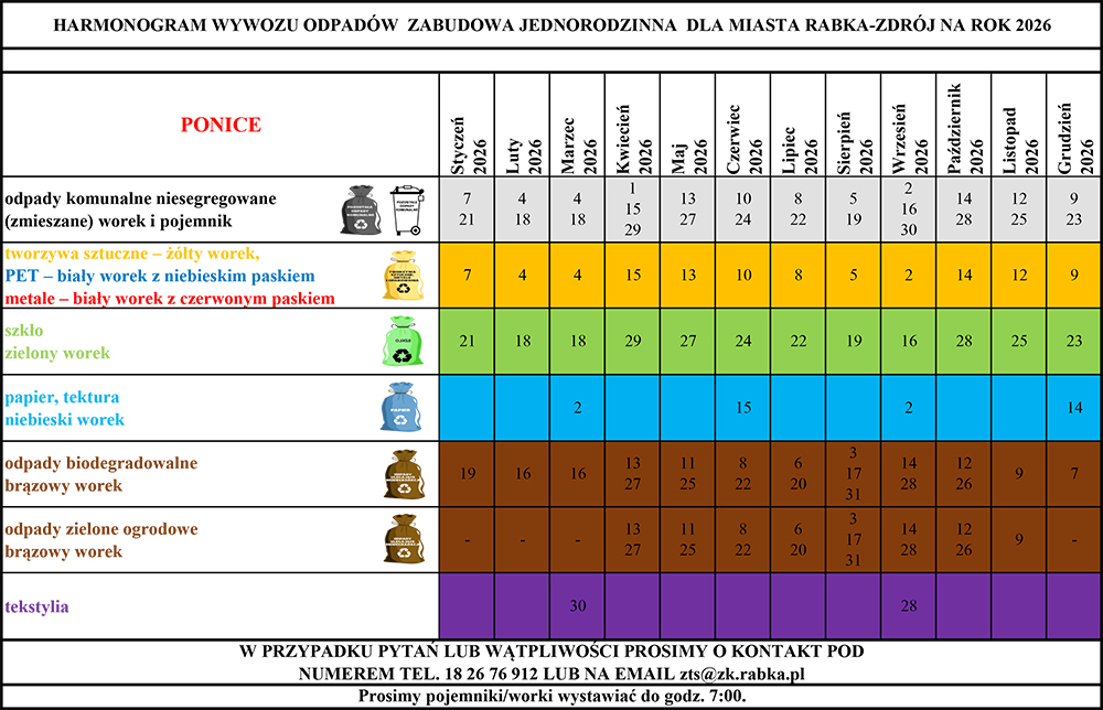Odbiorca odpadów komunalnych z terenu miasta i gminy Rabka-Zdrój informuje, iż od 1 stycznia 2026 roku wejdą w życie nowe harmonogramy wywozu nieczystości stałych w sołectwach Chabówka, Ponice i Rdzawka oraz na terenie miasta Rabka-Zdrój. Właściciele posesji proszeni są o zapoznanie się z nowym harmonogramem i dostosowanie się do rozkładu odbioru odpadów. Prosimy pojemniki/worki wystawiać do godz. 7.00.