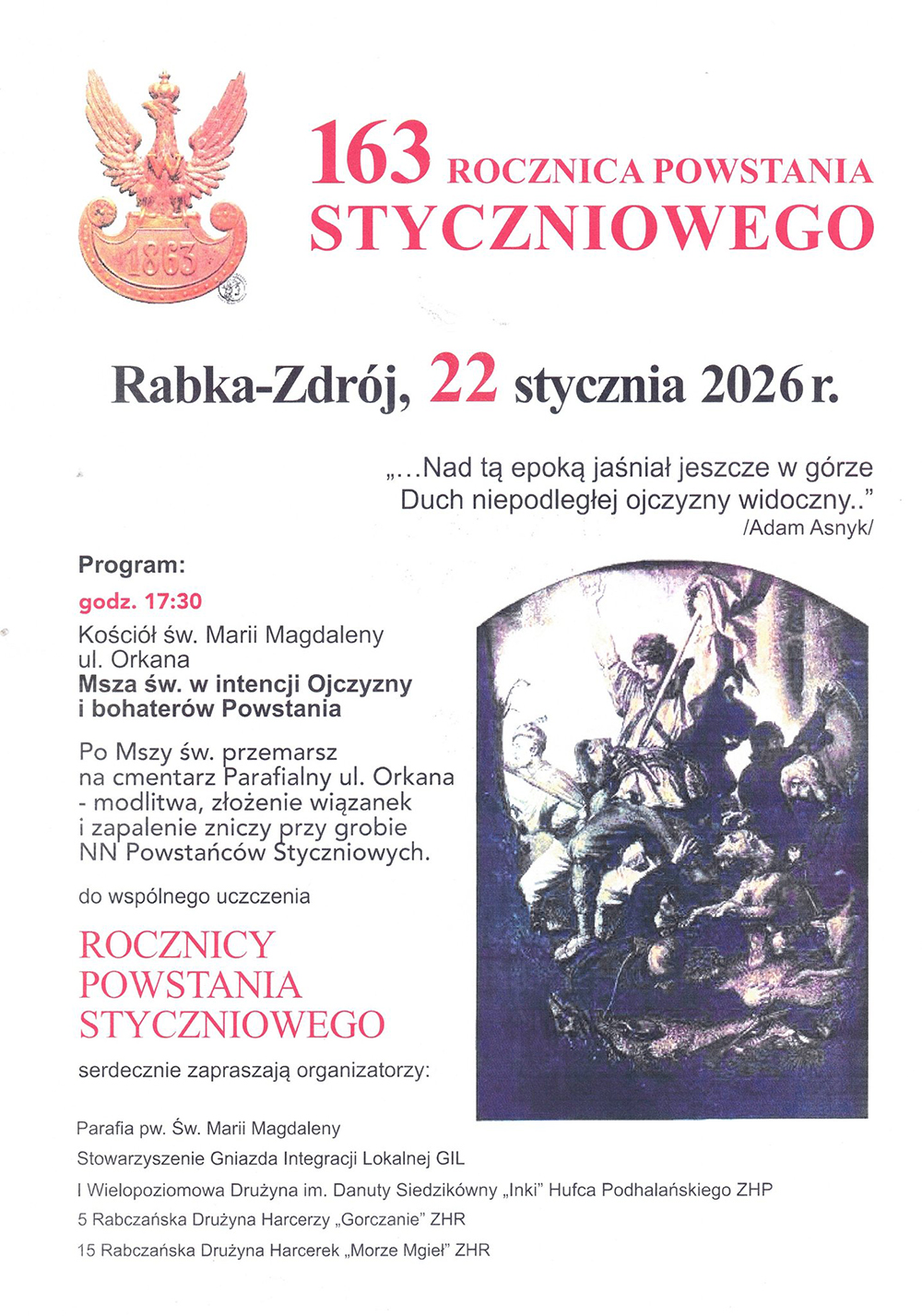 Msza święta w intencji Ojczyzny i bohaterów Powstania Styczniowego oraz modlitwa przy grobie powstańców złożą się na tegoroczne obchody 163. rocznicy zrywu niepodległościowego w Rabce-Zdroju, które odbędą się w czwartek 22 stycznia.