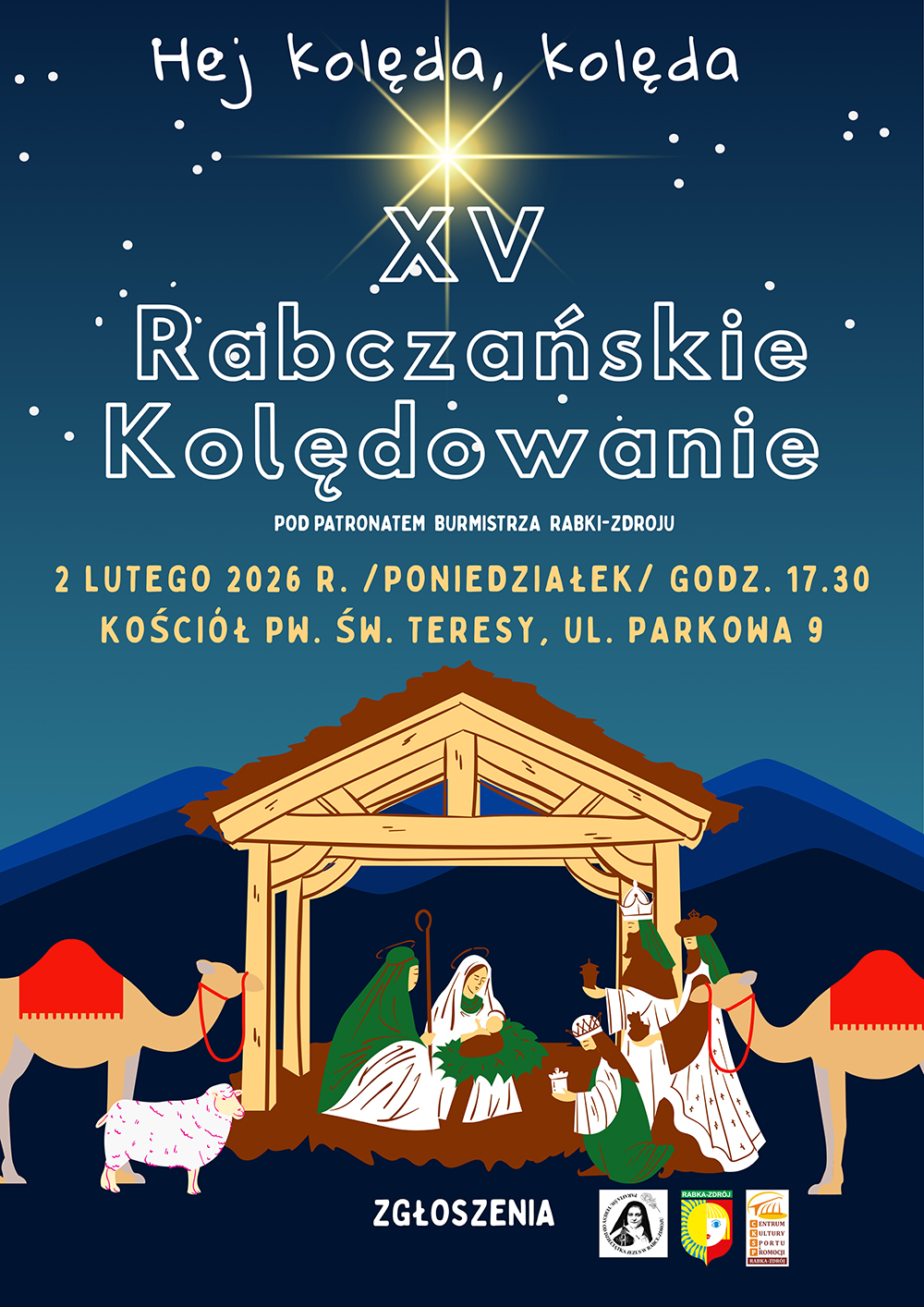 Burmistrz Rabki-Zdroju, Centrum Kultury, Sportu i Promocji oraz Parafia św. Teresy zapraszają do udziału w przeglądzie XV Rabczańskie Kolędowanie „Hej kolęda, kolęda”, który odbędzie się 2 lutego 2026 r. /poniedziałek/ w kościele pw. św. Teresy. Celem przeglądu jest prezentacja dorobku artystycznego uczestników, promocja twórczości artystycznej, kultywowanie i popularyzacja tradycji śpiewania kolęd i pastorałek. Chętni do udziału w przeglądzie mogą zgłaszać się do 26 stycznia 2026 r. Kartę zgłoszenia należy przesłać na adres: Centrum Kultury, Sportu i Promocji w Rabce-Zdroju,